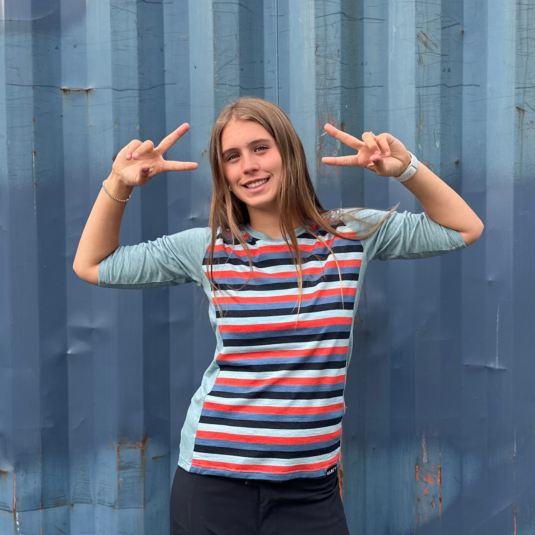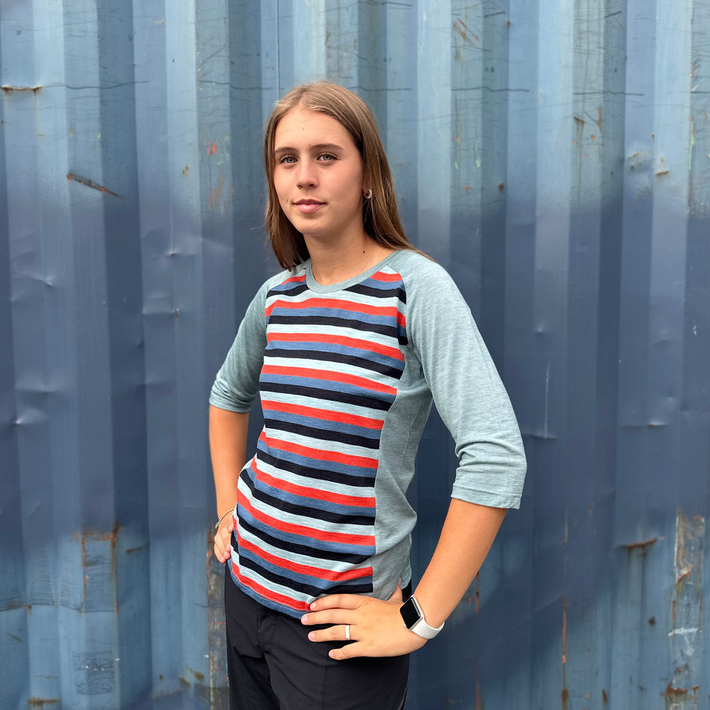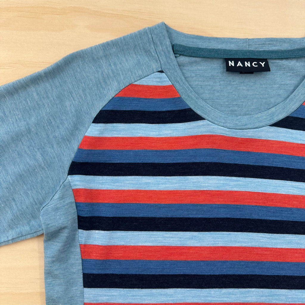 Fabric: A lovely lightweight blend of merino/tencel on the arms, side panels and back. The front panel is 100% merino stripe.